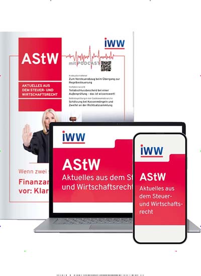 Die Zeitschrift AStW Aktuelles aus dem Steuer- und Wirtschaftsrecht ist eine führende Fachzeitschrift zu den Themen Steuerrecht und Wirtschaftsrechtsprechung. Die Wirtschaftszeitschriften für steuer- und rechtsberatende Berufe sind mit Fachartikeln zu allen Bereichen dieser Rechtsgebiete ein unverzichtbarer Begleiter für Fachanwälte und andere Experten in diesem Gebiet.