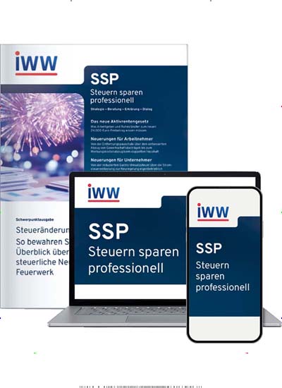 FK Familienrecht kompakt bekannt ist, deckt mit seinem Magazin SSP Steuersparen professionell einen weiteren sehr bedeutsamen Fachbereich ab. Dabei baut das IWW Institut auch bei dieser Zeitschrift auf seine klar strukturierte und anschauliche Berichterstattung, um Ihnen alle bedeutsamen Themen rund um den Bereich des Steuersparens auf eine fachlich fundierte aber dennoch verständliche Art und Weise näherzubringen.