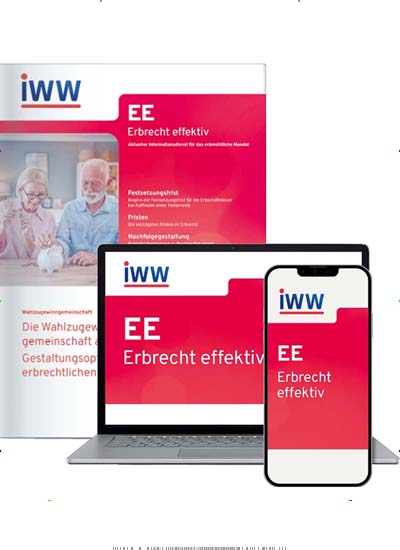 Verfestigen auch Sie mit einem Abo der EE Erbrecht effektiv Ihr vorhandenes Fachwissen und erweitern Sie dieses mit wertvollen Hintergrundinformationen und neuem Wissen rund um das Erbrecht. Halten Sie sich mit den Jura Zeitschriften zudem über die neusten Trends und Entwicklungen auf dem Laufenden und verpassen Sie zukünftig keine Reformen und Neuerungen mehr. Dank dieser Informationsvielfalt können Sie mithilfe der EE Erbrecht effektiv Ihre erbrechtlichen Fälle stets zum Erfolg führen und sparen sich dank der wertvollen Tipps und Tricks zudem noch wertvolle Zeit bei der Bearbeitung Ihrer Mandanten ein.