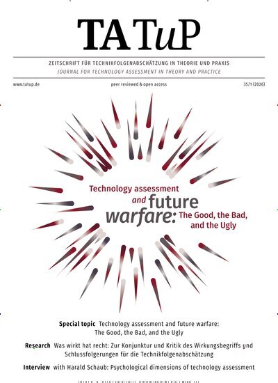 Das interdisziplinäre Fachmagazin rund um die TechnikfolgenabschätzungMit seinen transdisziplinären und interdisziplinären Inhalten zielen die Wissenschaftsmagazine TA TuP, die Sie auch als praktisches epaper erhalten, auf eine interdisziplinäre Öffentlichkeitsarbeit ab. So sollen transinterdisziplinäre Interessengruppen weltweit von den umfassenden Forschungsergebnissen sowie den hilfreichen Politikempfehlungen aus dem Bereich der Technikfolgenabschätzung profitieren. Mit diesem Ziel richtet sich das Magazin primär an alle Praktiker sowie an alle Interessierten aus den Bereichen der Wirtschaft, Wissenschaft und Politik, die sich umfassend mit soziotechnischen Technikentwicklungen oder dem Fachbereich der Technikfolgenabschätzung beschäftigen. Verpassen Sie mit einem Abo der TA TuP keine dieser wertvollen, interdisziplinären Informationen mehr und bleiben Sie damit rund um den Fachbereich der Technikfolgenabschätzung stets auf dem neusten Stand.