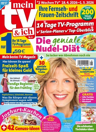 Was für eine attraktive Mischung: 14 Tage volles Fernsehprogramm und dazu jede Menge hilfreiche Berichte, Artikel und Ratgeber, die Frauen wirklich interessieren – das bietet Ihnen das Magazin Mein TV & ich, die bunte und vielseitige Fernseh- und Frauenzeitschrift für das tägliche Lesevergnügen.