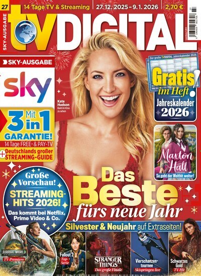 Die Programmzeitschrift TV Digital Sky Kabel Ausgabe erscheint mit 26 Ausgaben jährlich. Sie bietet eine umfangreiche Programminformation und eine hilfreiche Übersicht über das breite Spektrum der TV-Sender im Free- und Pay-Bereich. Leser:innen finden Tipps zu empfehlenswerten Sendungen, aktuelle Spielfilm-Highlights und Spartenprogramme auf zwei Doppelseiten pro Tag. Ein weiterer Vorteil ist der Filmplaner für digitale Kanäle. Wenn Sie TV Digital Sky Kabel Ausgabe bestellen, müssen Sie nicht mehr daran denken, die Zeitschrift am Kiosk zu besorgen. Mit einem Abonnement der TV Digital Sky Kabel Ausgabe Zeitschrift erhalten Sie die Magazine bequem nach Hause geliefert. Für digital Lesende ist die Zeitschrift auch als epaper erhältlich. Bestellen Sie die digitale Version und beginnen Sie sofort mit dem Lesen. Neben dem detaillierten Programmteil bietet das Magazin Hintergrundberichte, Reportagen, Interviews und Neuigkeiten aus Film und Fernsehen. Es werden außerdem Neuheiten aus Kino, DVDs, CDs und Spielen vorgestellt. Erfreuen Sie sich an einzigartigen Geschichten und aufregenden Fotostrecken mit Stars und Sternchen aus aller Welt. Sie können die Zeitschrift kaufen, um auch wichtige Informationen und Reportagen zu Sportereignissen sowie umfassende Technikberichte zu erhalten. Der Titel ist in der Kategorie