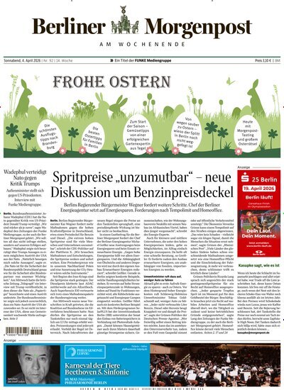 Berliner Morgenpost – exzellente Berichterstattung – breit gefächertes InformationsangebotDie Berliner Morgenpost befasst sich mit Themen aus der Politik und Wirtschaft und als Leser erfahren Sie auch die wichtigsten Neuigkeiten aus der Welt. Dabei legt die Redaktion größten Wert darauf, dass die Berliner Zeitung eine Zeitung für die Berliner bleibt. Hier finden Sie Berlins größten Regionalteil mit einem umfangreichen täglichen Service zu Kultur, Sport und Freizeit. Am Samstag gibt es zusätzlich das Magazin für die Familie.