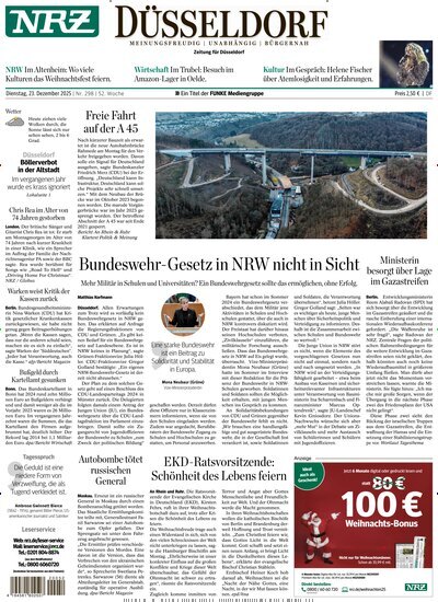 Zeitung berichtet außerdem über Freizeit, Familie, Digitalisierung und gesellschaftliche Trends. Auch Beiträge zu bürgerlichem Engagement, Stadtentwicklung und Bildung finden regelmäßig Platz. Jetzt das NRZ Neue Ruhr Zeitung für Düsseldorf Abonnement kaufen und keine relevanten Nachrichten mehr verpassen.