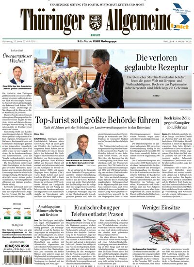 Die Thüringer Allgemeine Erfurt informiert Sie täglich über Entwicklungen in Erfurt sowie über bedeutende Ereignisse in Thüringen und darüber hinaus. LeserInnen erhalten fundierte Einblicke in Politik, Gesellschaft, Kultur und Sport – ergänzt durch regionale Themen mit hoher Relevanz für das Alltagsleben in der Landeshauptstadt. Die
