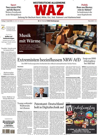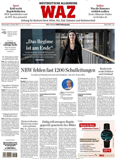 WAZ Westdeutsche Allgemeine Zeitung für Bochum kaufen – aktuelle Informationen für Menschen aus BochumDiese Ausgabe richtet sich an alle, die in Bochum leben oder sich für die Stadt interessieren. Die WAZ liefert verlässliche Nachrichten und Analysen zu relevanten Themen aus der Region sowie zur gesamtgesellschaftlichen Entwicklung. Die Redaktion legt dabei großen Wert auf lokale Besonderheiten und das, was BochumerInnen bewegt.