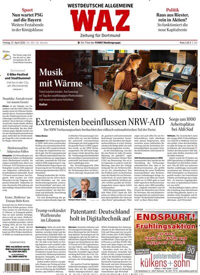 Warum bei United Kiosk die WAZ Westdeutsche Allgemeine Zeitung für Dortmund abonnieren?Diese Ausgabe ist als Einzelkauf oder im praktischen Abo bei United Kiosk erhältlich. LeserInnen haben so die Wahl, regelmäßig oder gezielt digital zu lesen. Für alle, die Wert auf Flexibilität legen, ist die digitale Variante besonders praktisch. Wer die WAZ Westdeutsche Allgemeine Zeitung für Dortmund digital lesen möchte, bleibt zeitnah und ortsunabhängig informiert.