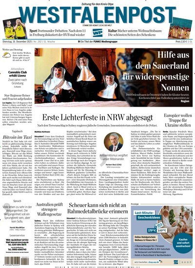 Die Westfalenpost Olpe informiert Sie täglich über lokale Ereignisse, gesellschaftliche Entwicklungen und Nachrichten aus dem Sauerland. LeserInnen erhalten fundierte Berichte zu Politik, Kultur, Wirtschaft und Alltagsthemen – mit besonderem Fokus auf Olpe und die Region Südwestfalen. Die